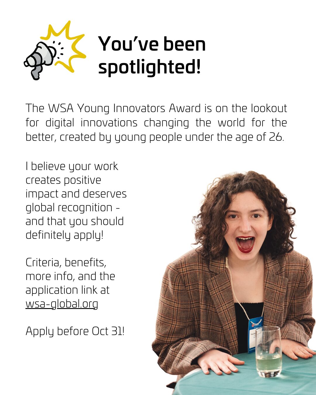 You can learn more and apply here: wsa-global.org/wsa_categories/wsa-young-innovators